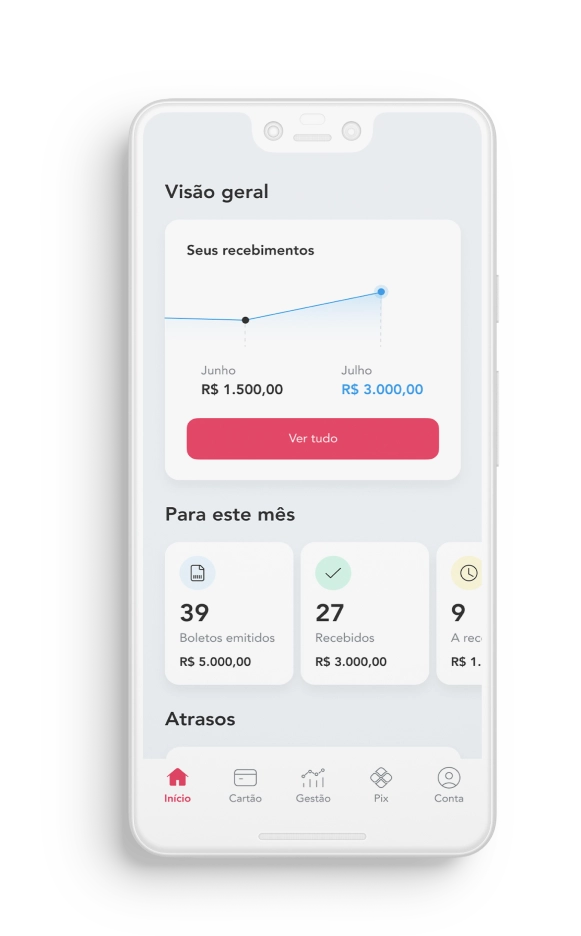 A Cora cuida disso para você, simplifica a emissão de boletos e envia lembretes automáticos de cobrança para os seus clientes.